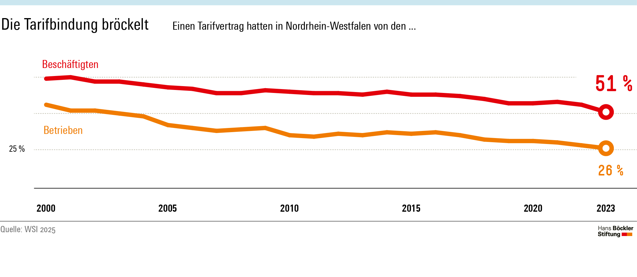 Infografik: Der Anteil der Beschäftigten mit Tarifvetrag ist in Nordrhein-Westfalen zwischen 2000 und 2023 von 74 auf 51 Prozent gesunken, der Anteil der tarifgebundenen Betriebe von 56 auf 26 Prozent.