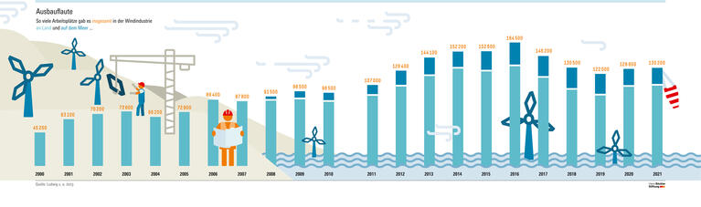 - So muss Deutschland etwa deutlich mehr erneuerbare Energie erzeugen. Der Ausbau der Windenergie stockt jedoch. Politische Entscheidungen wie die auf möglichst niedrige Preise ausgerichtete Ausschreibungspolitik für Windprojekte ab 2017 und strenge Abstandsregelungen in verschiedenen Bundesländern haben deutliche Spuren hinterlassen. In den Jahren 2017 bis 2019 hat die Branche zeitweise mehr als 40 000 Arbeitsplätze verloren – und damit auch viel Knowhow. Um die Windindustrie wieder zu stärken, sind auch bessere Arbeitsbedingungen nötig, zeigt eine von uns geförderte Studie.