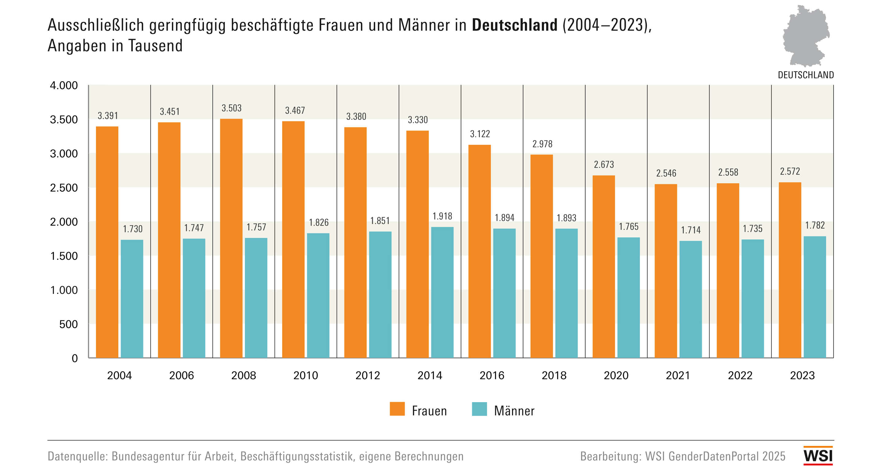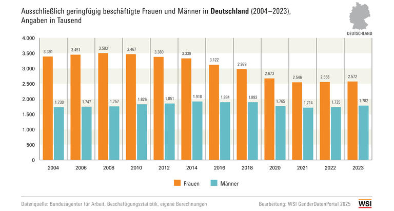 Dieses Risiko gilt besonders für Frauen: 2021 waren Frauen rund 1,5 mal so häufig ausschließlich geringfügig beschäftigt wie Männer. Im Jahresdurchschnitt hatte etwa jede siebte Frau, aber nur jeder elfte Mann ausschließlich einen Minijob.