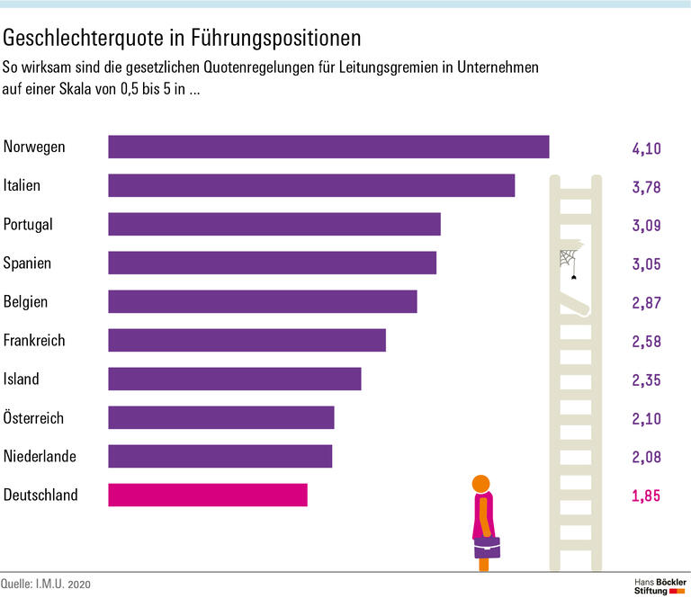 Um für mehr Gendergerechtigkeit in Führungsgremien zu sorgen, gibt es in vielen Ländern gesetzliche Geschlechterquoten. Insgesamt verfügen zehn von 31 europäischen Ländern diesbezüglich gesetzlich bindende Regeln. Laut einer Analyse des Instituts für Unternehmensmitbestimmung (I.MU.) war davon die gesetzliche Geschlechterquote in Deutschland im Jahr 2019 die schwächste. Auch wenn sich seitdem einiges geändert haben dürfte, ein Problem dabei bleibt: Das entsprechende Gesetz bezieht sich allein auf börsennotierte Unternehmen, die paritätisch mitbestimmt sind. In 10 der 14 europäischen Aktiengesellschaften (SE) im wichtigsten deutschen Börsenindex DAX gilt die verbindliche Geschlechterquote für Aufsichtsrat und Vorstand beispielsweise nicht. Die Rechtsform der SE läuft mit ihren Schlupflöchern zur Vermeidung von Mitbestimmung in ihrer derzeitigen Form also auch Bemühungen um mehr Gleichstellung in Führungspositionen zuwider.