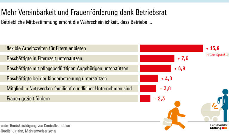 Welche Potenziale Digitalisierung und Homeoffice für mehr Gleichstellung haben und warum gute Regelungen in diesem Kontext wichtig sind, zeigt eine von uns geförderte Studie. Eine wichtige Rolle spielt, wie eine weitere Studie zeigt, dabei und darüber hinaus die Mitbestimmung. Unternehmen mit Betriebsrat schneiden in Sachen Vereinbarkeit von Beruf und Familie besser ab als ohne.