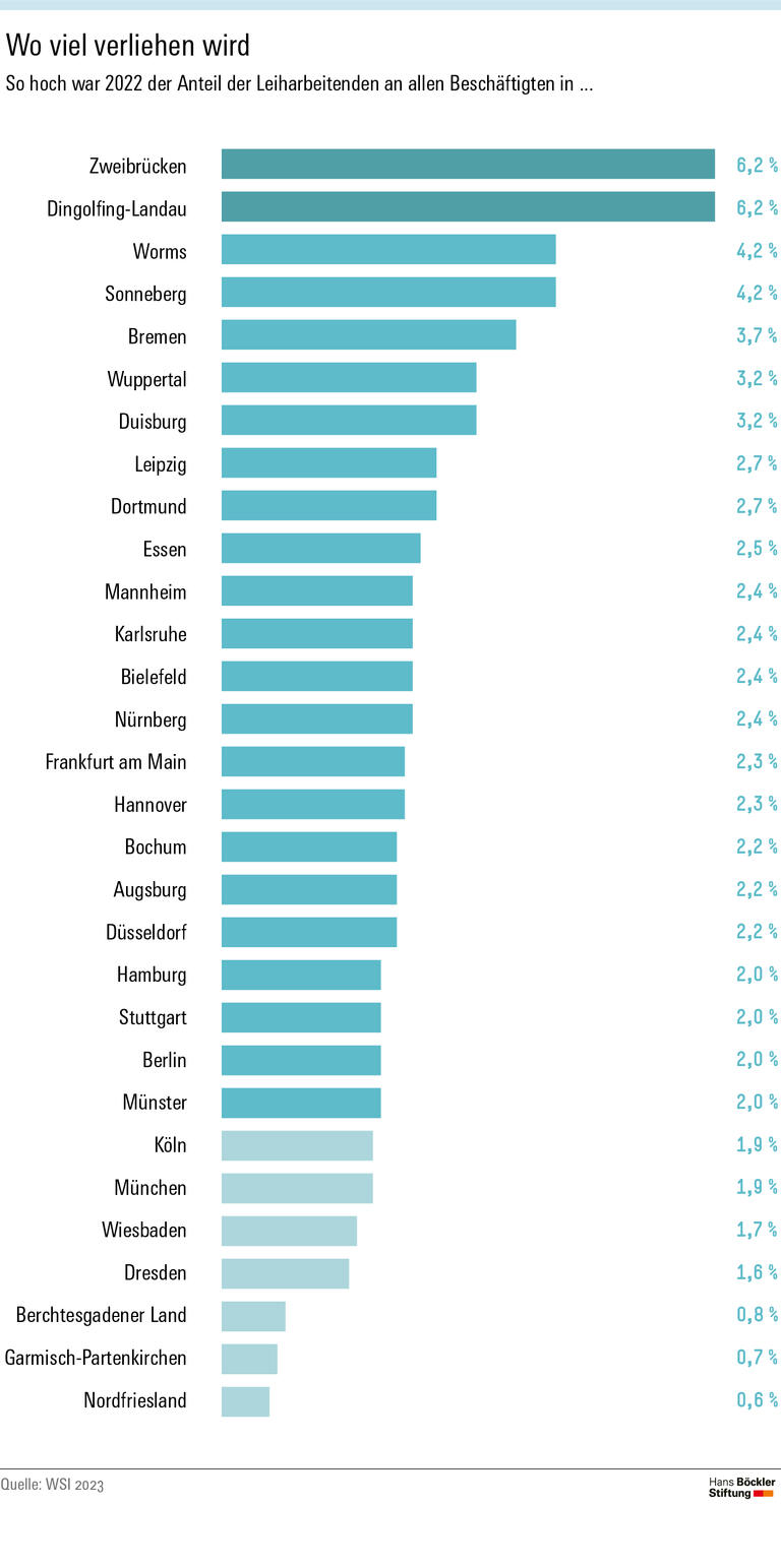 Während die Unterschiede zwischen West- und Ostdeutschland nicht auffällig sind, bestehen der Auswertung zufolge beachtliche Unterschiede auf der Ebene der Arbeitsmarktregionen. Am niedrigsten ist der Anteil der Leiharbeitenden in Nordfriesland mit 0,6 Prozent, in Garmisch-Partenkirchen mit 0,7 Prozent und im Berchtesgadener Land mit 0,8 Prozent. In Dingolfing-Landau und Zweibrücken ist die Leiharbeit hingegen sehr verbreitet. Dort stehen jeweils 6,2 Prozent der Beschäftigten in einem solchen Beschäftigungsverhältnis. In Worms und Sonneberg sind es jeweils 4,2 Prozent. Da die Leiharbeit in der Lagerwirtschaft eine große Rolle spielt, lassen sich die Unterschiede teilweise auf die Bedeutung dieser Branche für die regionale Ökonomie zurückführen, erklärt WSI-Experte Seils.