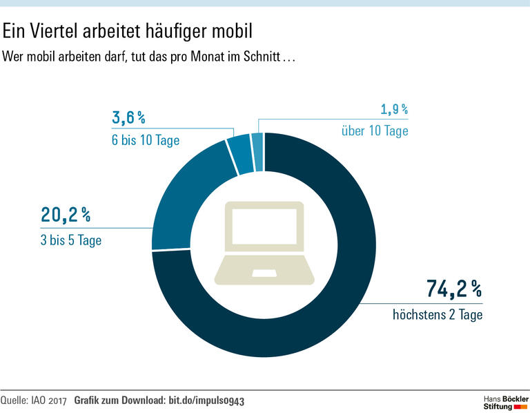 Ansonsten ist vor allem die Art der Tätigkeit maßgeblich: Akademiker dürfen eher zu Hause oder unterwegs arbeiten als Geringqualifizierte, Führungskräfte eher als ihre Untergebenen. Wer sich direkt in der Produktion verdingt, hat vergleichsweise selten diese Möglichkeit. Dasselbe gilt für Schichtarbeiter. Kinder unter 14 Jahren verbessern die Aussichten auf mobile Arbeit. Von den Beschäftigten, die zwar mobil arbeiten könnten, dies aber nicht tun, nennt ein Drittel fehlende technische Voraussetzungen als Grund. Bei einem Drittel liegt es am Vorgesetzten. Ein Fünftel verweist auf die räumliche Situation, hat also daheim beispielsweise kein geeignetes Arbeitszimmer. Dass der Datenschutz außerhalb der Betriebsstätte nicht gewährleistet wäre, gibt ein Zehntel zu Protokoll.