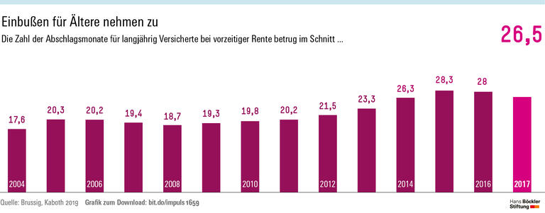 - Betrachtet man nur die langjährig Versicherten mit wenigstens 35 Versicherungsjahren, zeigt sich: Die Abschläge, die Ältere bei vorzeitigem Rentenbeginn in Kauf nehmen müssen, sind deutlich gestiegen. Zwischen 2004 und 2017 nahm die durchschnittliche Anzahl der sogenannten Abschlagsmonate um zehn zu, aktuell liegt sie bei etwa 27 Monaten. Jeder Monat, den man früher in Rente geht, mindert die Rentenbezüge um 0,3 Prozent.