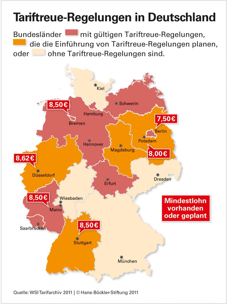 Bremen, Berlin und Rheinland-Pfalz flankieren ihre Tariftreue-Regelung mit einem vergabespezifischen Mindestlohn. Unternehmen können einen öffentlichen Auftrag nur erhalten, wenn sie ihren Beschäftigten bei der Auftragsdurchführung brutto mindestens 7,50 Euro bzw. 8,50 Euro pro Stunde zahlen. Auch Baden-Württemberg, Brandenburg und Nordrhein-Westfalen planen einen vergabespezifischen Mindestlohn. In NRW soll dieser bei 8,62 Euro liegen. Das entspricht der untersten Lohngruppe im Tarifvertrag der Länder.