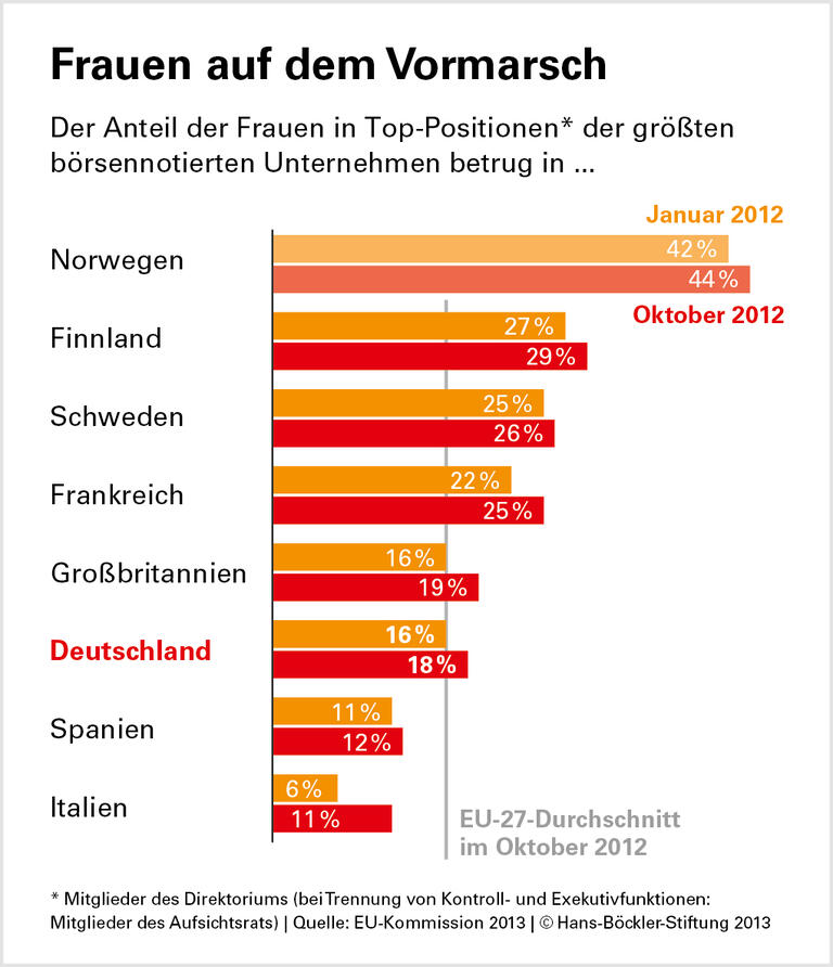 „Die Unternehmen begreifen allmählich, dass sie es sich einfach nicht leisten können, auf die Frauen und ihr Potenzial zu verzichten“, sagt Viviane Reding, Vizepräsidentin der Europäischen Kommission. Nie zuvor sei der Frauenanteil binnen Jahresfrist so schnell gestiegen. In den Ländern mit einer Quotenregelung passierte am meisten: So verzeichnet Italien, wo diese erst seit kurzem gilt, einen Zuwachs um knapp fünf Prozentpunkte. Frankreich ist das erste Land in der EU, in dem in den obersten Gremien aller großen börsennotierten Unternehmen inzwischen mehr als eine Frau sitzt. Hier gilt die Geschlechterquote seit 2011. Jetzt sind dort 25 Prozent der Top-Entscheider weiblich. EU-weit wird allerdings immer noch ein Viertel der größten Unternehmen allein von Männern geführt, schreibt die Europäische Kommission.