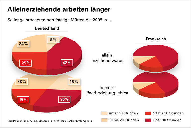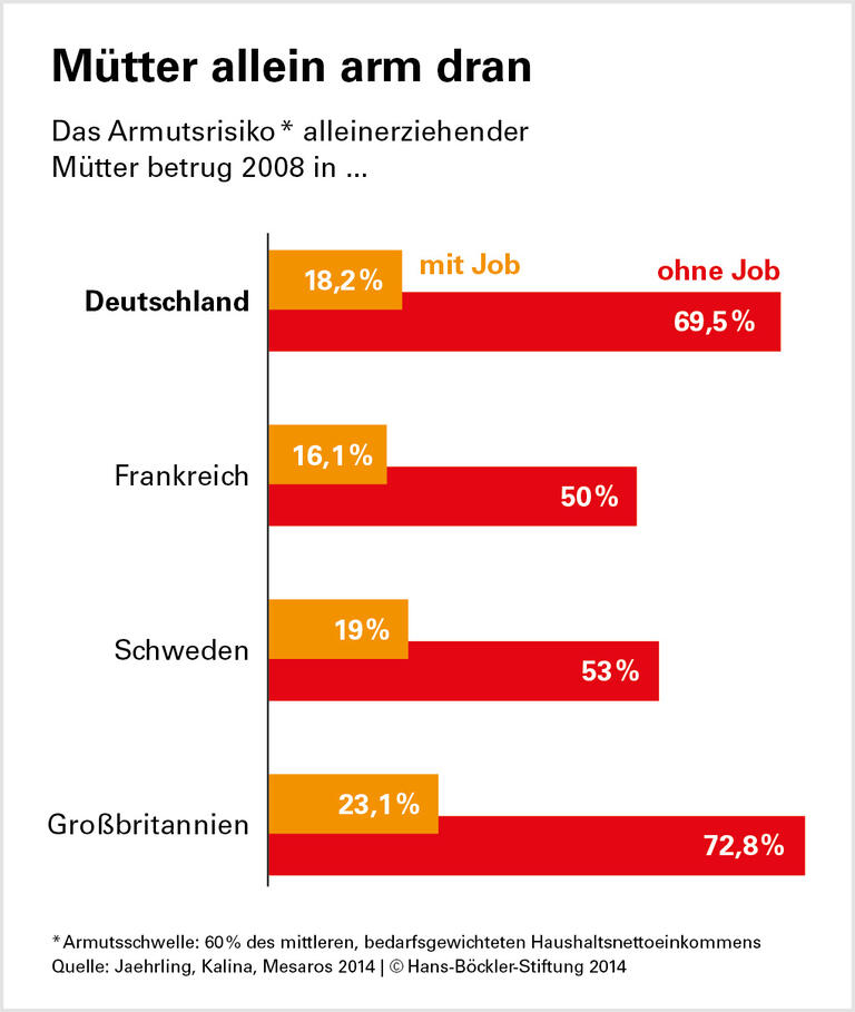 Unterschiedlich ist auch die Zahl der Alleinerziehenden, die auf bedürftigkeitsgeprüfte Sozialhilfeleistungen angewiesen sind. Hierzulande bekamen 2008 rund 40 Prozent Hartz IV. Während die britische Quote ein ähnliches Niveau erreichte, fiel der Anteil in Frankreich und Schweden nur halb so hoch aus. Dafür erhalten dort mehr Alleinerziehende das separate Wohngeld.