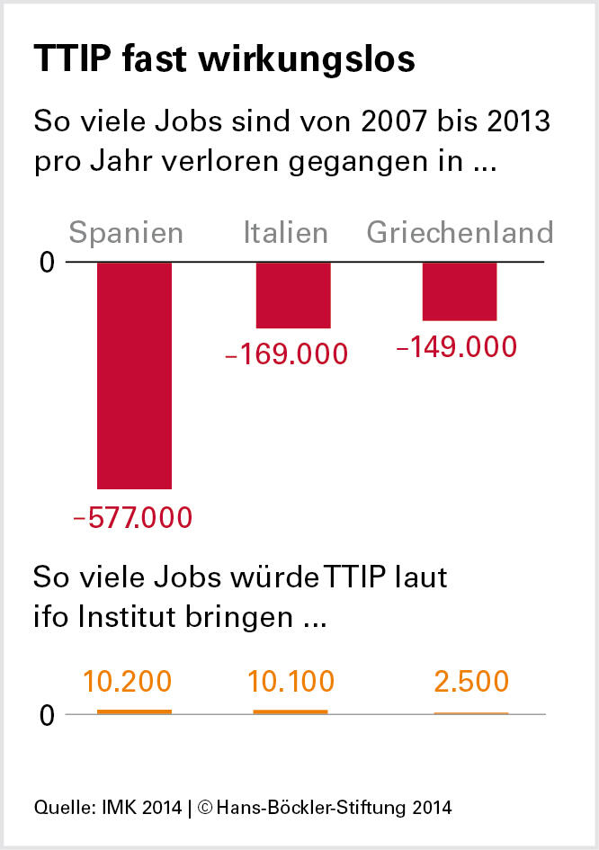 Drei Untersuchungen werden häufig herangezogen, um die vermeintlichen Vorteile von TTIP (Transatlantic Trade and Investment Partnership) zu belegen: Eine Studie des Londoner Centre for Economic Policy Research (CEPR) und zwei Arbeiten des Münchener ifo Instituts. IMK-Forscherin Sabine Stephan hat sich deren Modellrechnungen genauer angeschaut. Ihr Fazit: Selbst unter den „außerordentlich optimistischen Annahmen“ der Institute „sind die erwarteten Wachstums- und Beschäftigungseffekte winzig“. Nichtsdestotrotz stelle die EU-Kommission TTIP als Mittel gegen die vor allem in Südeuropa grassierende Arbeitslosigkeit dar.
