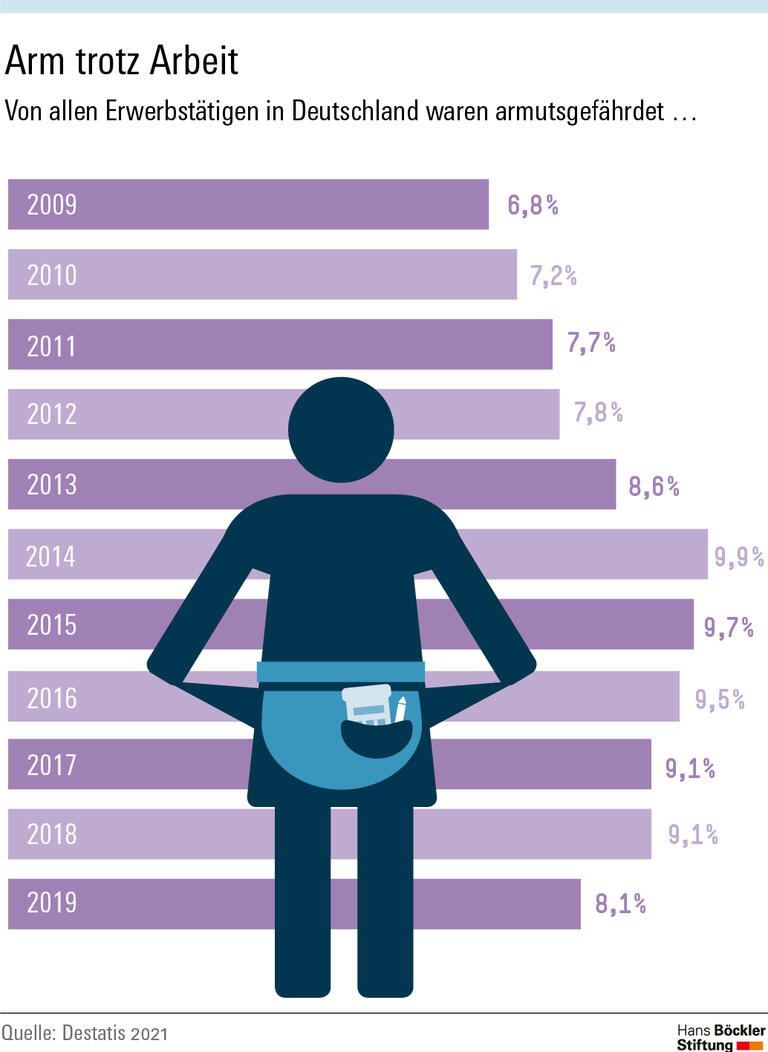 Rund acht Prozent der Erwerbstätigen in Deutschland waren im Jahr 2019 von Armut betroffen, sie waren also arm trotz Arbeit. Und unter allen Armen haben drei von zehn Menschen regelmäßig gearbeitet. Als arm gelten Personen, deren bedarfsgewichtetes Netto-Haushaltseinkommen geringer ist als 60 Prozent des Medianeinkommens. 2019 lag die Armutsgrenze für eine alleinlebende Person bei monatlich 1176 Euro, für zwei Erwachsene mit zwei Kindern unter 14 Jahren bei 2469 Euro. Im Zuge der Coronakrise und der damit verbundenen Zunahme von Kurzarbeit dürfte der Anteil derer, die trotz regelmäßiger Arbeit von Armut bedroht sind, noch gestiegen sein.
