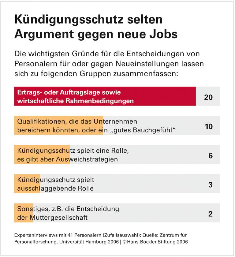 "Im praktischen Alltag der Personalverantwortlichen scheinen der Kündigungsschutz und andere arbeitsrechtliche Bestimmungen keine große Rolle bei der Entscheidung für Neueinstellungen zu spielen", urteilen die Hamburger Forscher. Die gern verwendete Metapher des Kündigungsschutzes als "Job-Bremse" sei fehl am Platz.