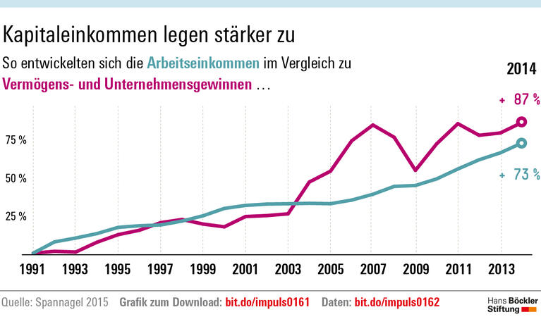 Die verfügbaren Einkommen der unteren 40 Prozent der Verteilung sind in den letzten 15 Jahren gesunken. Selbst in der Mitte der Bevölkerung sind die Entgelte unter Berücksichtigung der Inflation lediglich konstant geblieben. Die Zuwächse der oberen 10 Prozent fallen hingegen „weit überdurchschnittlich“ aus. Angetrieben wird diese Entwicklung vor allem durch die wachsende Bedeutung von Kapitaleinkommen: In den 1990er-Jahren stiegen Gewinneinkommen und Arbeitnehmerentgelte zunächst parallel an, zwischen 2003 und 2007 schossen Erstere dann in die Höhe. Der Anteil der Arbeitseinkommen am gesamten Volkseinkommen ist dadurch zurückgegangen – die Lohnquote sank von 72,5 Prozent im Jahr 2000 auf aktuell rund 69 Prozent.