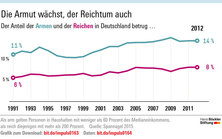Zugleich ist die Armut gewachsen: Anfang der 2000er-Jahre galten 10 Prozent der Deutschen als arm, 2012 gut 14 Prozent. Der Anteil der Reichen ist ebenso gestiegen – daran hat auch die Finanzkrise nichts geändert. „Die sehr Reichen schweben regelrecht über den konjunkturellen Krisen, während viele Arme auch von einem länger andauernden wirtschaftlichen Aufschwung kaum profitieren können“, so die Autorin. Die Verteilung der Einkommen sei in den letzten drei Jahrzehnten deutlich ungleicher geworden – und zugleich habe sich die Chancengleichheit verringert: Arme blieben heute mit höherer Wahrscheinlichkeit arm, Reiche reich.