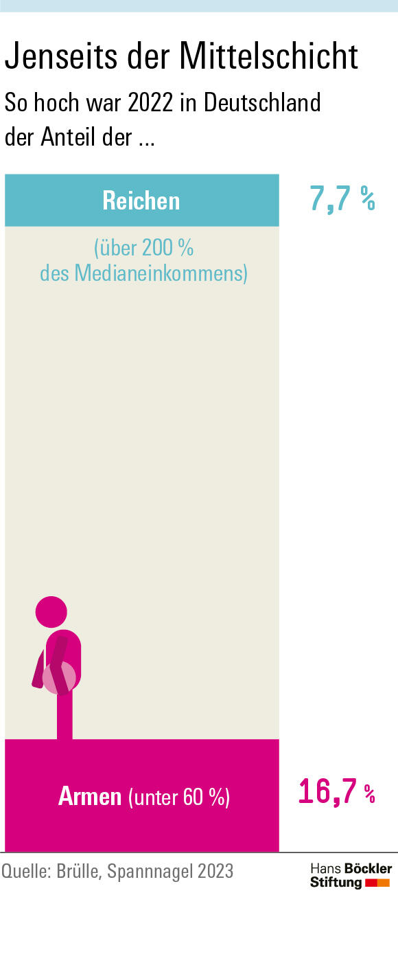 Im Jahr 2022 lebten 16,7 Prozent der Bevölkerung in Armut, 10,1 Prozent sogar in strenger Armut. 2010 waren es noch 14,5 und 7,7 Prozent. Während der Coronakrise stieg die Armutsquote zunächst weiter an, wobei auch hier der Vergleich zwischen 2020 und den vorherigen Jahren nur eingeschränkt möglich ist. Von 2021 auf 2022 sank sie geringfügig von 16,9 auf 16,7 Prozent. Als eine mögliche Erklärung nennen Brülle und Spannagel die Entlastungsmaßnahmen, die die Politik 2022 auf den Weg gebracht hat. Auch wenn die oberen Einkommensschichten in absoluten Zahlen mindestens ähnlich stark profitiert haben, habe die Bundesregierung mit ihrer Anti-Krisen-Politik möglicherweise einen kleinen Beitrag zur Armutsbekämpfung geleistet.