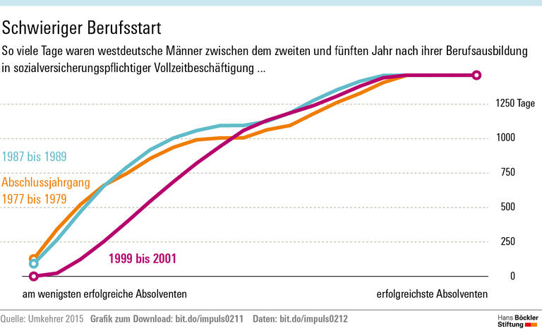 Als Maß für die Beschäftigungsstabilität in der Frühphase des Berufslebens hat der Forscher die Anzahl der Tage in sozialversicherungspflichtiger Vollzeitbeschäftigung zwischen dem Anfang des zweiten und dem Ende des fünften Jahrs nach dem Abschluss summiert. Dabei zeigt sich im Zeitverlauf eine zunehmende Polarisierung: Während die erfolgreichere Hälfte der Berufseinsteiger in allen Kohorten ähnlich lange Beschäftigungsphasen aufweist, hat sich die Situation bei der anderen Hälfte merklich verschlechtert. Die Wahrscheinlichkeit, in den ersten fünf Jahren nach der Ausbildung nicht einen einzigen Tag Vollzeit zu arbeiten, ist von zwei Prozent in den 1970er- und 1980er-Jahren auf acht Prozent in den 1990er-Jahren gestiegen. Parallel dazu hat die Ungleichheit bei den Bruttolöhnen im achten Jahr nach dem Berufseinstieg deutlich zugenommen.