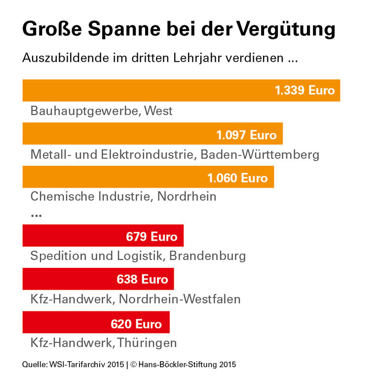 Die regionalen Unterschiede sind zum Teil beträchtlich: „Die aktuellen Ausbildungsvergütungen zeigen ähnliche Differenzierungen wie die Tariflöhne und -gehälter“, sagt WSI-Tarifexperte Reinhard Bispinck. „Neben bundeseinheitlichen Tarifverträgen gibt es solche mit starken regionalen Unterschieden, häufig verbunden mit einem West-Ost-, aber auch mit einem Süd-Nord-Gefälle.“ Während die Differenzen in der Metall- und Elektroindustrie sowie in der chemischen Industrie eher gering ausfallen, spielt der Ausbildungsort beim Groß- und Außenhandel eine erhebliche Rolle: Azubis im dritten Ausbildungsjahr verdienen in Mecklenburg-Vorpommern 765 Euro, in Hessen dagegen 943 Euro. In der Textilindustrie liegen die Vergütungen zwischen 770 Euro im Osten und 979 Euro in Hessen. Am größten sind die Abstände im Hotel- und Gaststättengewerbe: In Mecklenburg-Vorpommern gibt es 610 Euro, in Bayern 896, also 286 Euro mehr.