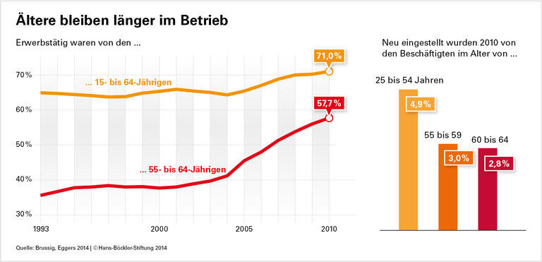 Die Arbeitnehmerschaft wird älter: Die Zahl der erwerbstätigen 55- bis 64-Jährigen sei zwischen 2000 und 2010 von 4,2 auf 5,7 Millionen gestiegen, schreiben Martin Brussig und Katarina Eggers im neuen, von der Hans-Böckler-Stiftung geförderten Altersübergangs-Report. Wegen fehlender Möglichkeiten zur Frühverrentung seien Beschäftigte immer länger auf einen Arbeitsplatz angewiesen. Die Forscher vom Institut Arbeit und Qualifikation (IAQ) haben untersucht, inwieweit sich diese Entwicklung auch in der Einstellungspolitik der Betriebe niederschlägt. Ihrer Analyse zufolge ist die steigende Erwerbsbeteiligung Älterer vor allem darauf zurückzuführen, dass Arbeitnehmer länger in bestehenden Jobs tätig sind. Wenn es hingegen darum geht, Stellen neu zu besetzen, kommen ältere Bewerber weiterhin vergleichsweise selten zum Zuge.
