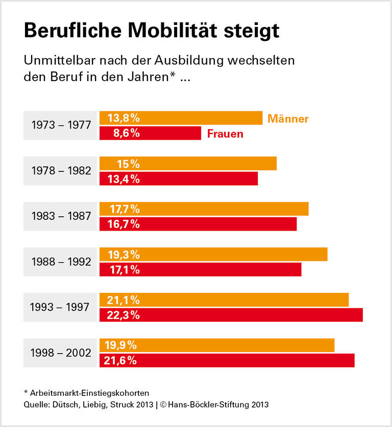 Inwieweit ihre Annahmen zutreffen, haben Dütsch, Liebig und Struck mit Hilfe des Datensatzes „Arbeiten und Lernen im Wandel“ überprüft, den das Institut für Arbeitsmarkt- und Berufsforschung erhoben hat. In ihre Analyse eingeflossen sind Angaben zum Schul- und Ausbildungsverhalten sowie zum beruflichen Werdegang von über 4.000 westdeutschen Erwerbstätigen, die zwischen 1956 und 1988 geboren wurden. Laut den Berechnungen hat sich die horizontale Mobilität vor allem am Anfang des Erwerbslebens deutlich erhöht: Von den Männern, die zwischen 1973 und 1977 auf dem Arbeitsmarkt gestartet sind, wechselten 14 Prozent unmittelbar nach der Ausbildung den Beruf. In der jüngsten untersuchten Kohorte, deren Berufseinstieg in die Jahre zwischen 1998 und 2002 fällt, waren es 20 Prozent. Bei den Frauen stieg der Anteil im gleichen Zeitraum von 9 auf 22 Prozent.
