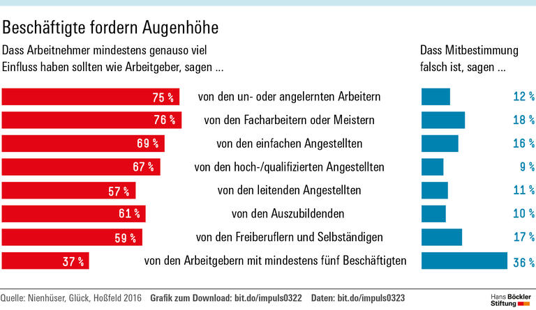 Der Anteil derjenigen, die finden, dass Arbeitnehmer mindestens gleich viel Einfluss haben sollten wie Arbeitgeber, liegt bei 65 Prozent. Noch deutlicher fällt die Gegenprobe aus: Der Aussage, dass Mitbestimmung falsch sei, stimmten nur 13 Prozent der Befragten zu. Dabei wurde nicht unterschieden zwischen betrieblicher Mitbestimmung und der Mitsprache in Aufsichtsräten.