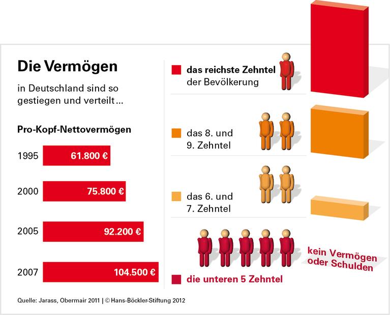 Deutsche Haushalte besaßen 2007 Immobilien, Wertpapiere und andere Anlagen im Wert von 8,6 Billionen Euro. Dies ist die jüngste vom Finanzministerium veröffentlichte Zahl zum privaten Nettovermögen, das sich aus der Aufrechnung von Vermögen und Schulden ergibt. 60 Prozent davon befinden sich laut Deutschem Institut für Wirtschaftsforschung in den Händen des wohlhabendsten Zehntels der erwachsenen Bevölkerung, während rund zwei Drittel netto nicht über nennenswerten Besitz verfügen.