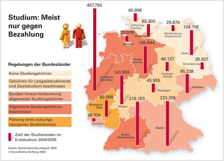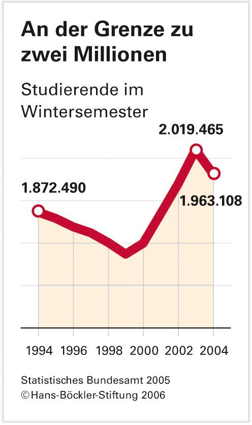 Daran wird sich so rasch nichts ändern. Die Studienneigung der Abiturienten und Fachabiturienten nimmt nicht zu, sondern schwindet. Obwohl 2004 im Vergleich zum Vorjahr 17.000 mehr Schulabgänger eine Studienberechtigung erwarben, ist zum Wintersemester 2004 die absolute Zahl der Erstsemester gesunken. Der Negativ-Trend wird sich fortsetzen, erwarten die Expertinnen. Eine Ursache dafür - wenn auch nicht die alleinige - dürfte die Ankündigung von Studiengebühren sein. Denn Gebühren, noch dazu ohne soziale Flankierung, können gerade Abiturienten aus finanziell schwächeren Familien vom Studium abschrecken.