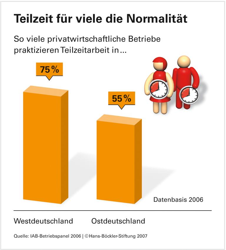 Teilzeitarbeit: Westdeutsche Betriebe mit Betriebsrat praktizieren häufiger sozialversicherungspflichtige Teilzeitarbeit und deutlich seltener geringfügige als die Vergleichsgruppe ohne Interessenvertretung. Insgesamt fällt der Anteil der geringfügig Beschäftigten in Betrieben mit Betriebsrat niedriger aus. "Betriebsräte fördern also gute und hemmen prekäre Teilzeitbeschäftigung", folgern Ellguth und Promberger. In ostdeutschen Betriebsratsbetrieben sei insgesamt eine ähnliche Entwicklung zu beobachten. Der positive Einfluss der Betriebsräte auf die betriebliche Ausgestaltung der Teilzeit ist für eine wachsende Zahl von Beschäftigten von großer Bedeutung: Inzwischen sind unterschiedliche Teilzeitmodelle bei mehr als der Hälfte der privatwirtschaftlichen Betriebe in Ostdeutschland und drei Vierteln der Betriebe in Westdeutschland verbreitet.