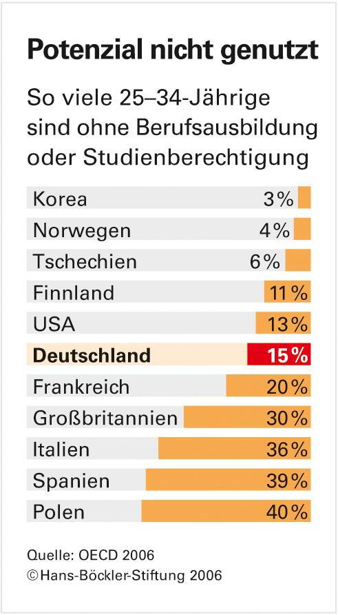 Der Stillstand in Deutschland führt dazu, dass sich weiterhin etwa 14 bis 16 Prozent ohne Qualifikationen auf dem Arbeitsmarkt behaupten müssen. Dabei ist es durchaus möglich, die Quote der schlecht Ausgebildeten deutlich zu reduzieren. Die OECD-Staaten in Ostasien machen das vor.