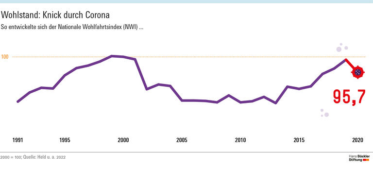 Weil etwa Mobilität und Wirtschaftstätigkeit in der Coronakrise zurückgingen, verringerten sich umweltschädliche Effekte wie die Emission von Schadstoffen. Indirekt wirkte sich auch die staatliche Stabilisierungspolitik positiv auf den NWI aus: Kurzarbeitsgeld und Hilfszahlungen reduzierten Einkommensverluste. Trotzdem entstand 2020 unter dem Strich ein Wohlstandsverlust von gut 50 Milliarden Euro, vor allem, weil der Konsum der Privathaushalte stark abfiel.