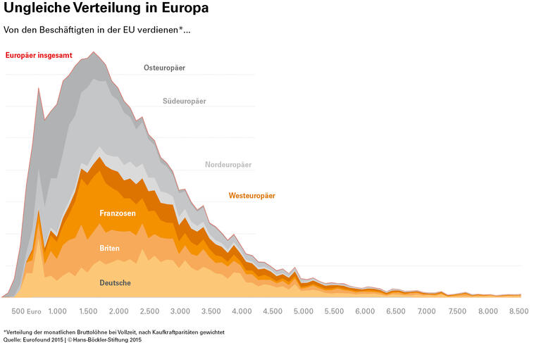 Betrachtet man, wie sich die Beschäftigten der Mitgliedsländer auf die gesamteuropäische Lohnpyramide aufteilen, fällt auf, dass im unteren Fünftel die Osteuropäer dominieren. Nationale Muster sind klar zu erkennen: In Griechenland, Portugal und allen osteuropäischen Staaten außer Slowenien verdienen drei Viertel der Beschäftigten weniger als 2.000 Euro im Monat, in den nordischen und den kontinentalen Ländern liegen drei Viertel über 2.000 Euro. Allerdings sind Deutschland und Großbritannien trotz ihres insgesamt hohen Lohnniveaus laut Eurofound auch mit „signifikanten Anteilen“ am unteren Ende der Skala vertreten. Insbesondere die britische Arbeitnehmerschaft weise eine „bemerkenswerte Polarisierung“ auf: Fast die Hälfte des reichsten Prozents der Europäer besteht aus Briten, gleichzeitig sind zahlreiche britische Beschäftigte in den unteren beiden Fünfteln der EU-Lohnverteilung anzutreffen.