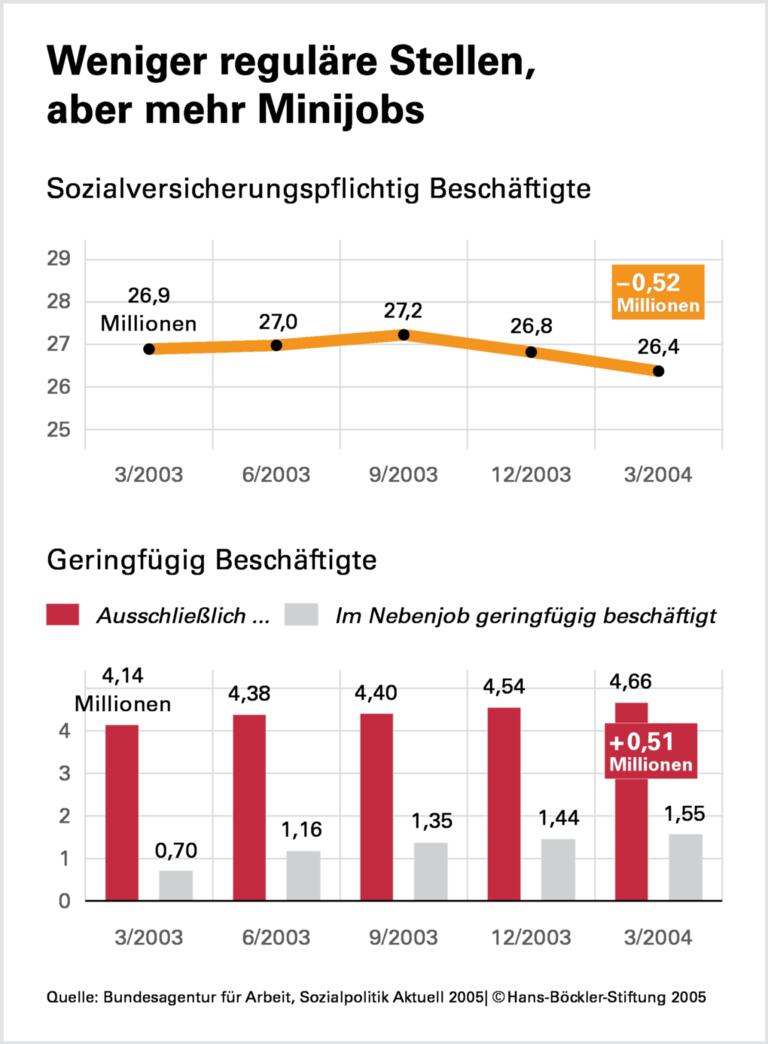 Fest steht: Seit Einführung der Minijob-Regelung sind sozialversicherungspflichtige Arbeitsplätze verloren gegangen. Im Dezember 2004 zahlten rund 26,5 Millionen Beschäftigte voll in die Sozialversicherung ein - fast 260.000 weniger als ein Jahr zuvor. Gleichzeitig arbeiteten 6,84 Millionen gewerblich Beschäftigte versicherungsfrei auf 400-Euro-Basis - über 690.000 mehr als Ende 2003. Alle auf ehemals regulären Stellen?