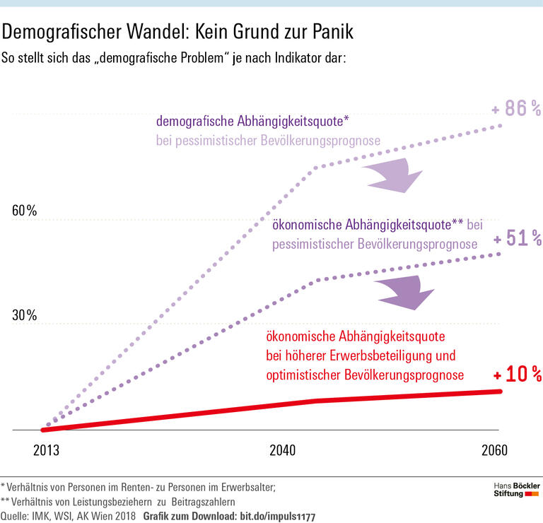 Prognosen zum demografischen Wandel und seinen Folgen für die Alterssicherung zeichnen oft „Katastrophenszenarien“, konstatieren die Forscher. Sie schreiben vermeintlich stabile demografische Trends über Jahrzehnte fort, obwohl es signifikante Änderungen gibt. Vor allem setzen sie auf ungeeignete Indikatoren, so IMK, WSI und AK Wien. Tatsächlich werde, anders als oft dargestellt, das für die Lastenverteilung wichtige Verhältnis zwischen Erwerbstätigen und Leistungsempfängern nicht nur durch den „Altenquotienten“ – die Zahl der Alten im Verhältnis zur Zahl der Jungen – bestimmt. Mindestens ebenso wichtig sei der ökonomische Status der Menschen: Wer ist wirtschaftlich von wem abhängig? Dazu komme, dass viele Einschätzungen auf Arbeitsmarktdaten beruhen, in denen die aktuelle Erwerbstätigkeit über- und Arbeitslosigkeit unterschätzt wird. Ausgeblendet werde damit, dass in Deutschland trotz deutlich gesunkener Arbeitslosigkeit heute und in der Zukunft noch erhebliche Beschäftigungspotenziale brachliegen. Würden diese Potenziale ins Blickfeld gerückt, werde deutlich, dass dem Arbeitsmarkt die „Schlüsselrolle“ für eine „sozial und ökonomisch sinnvolle Bewältigung des demografischen Wandels“ zukommt.