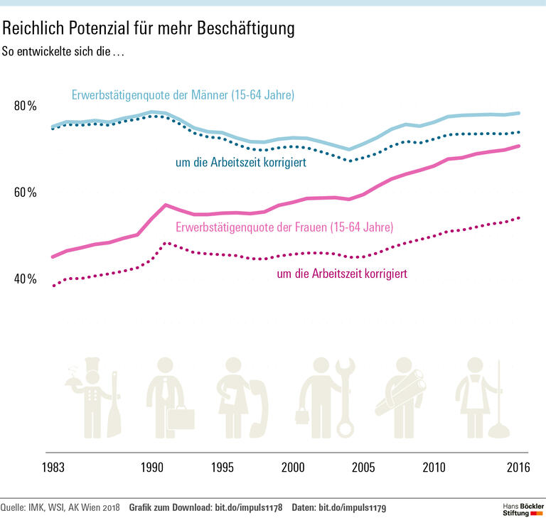 Die deutsche Gesellschaft altert. Die ökonomischen Folgen sind aber beherrschbar. Das betrifft auch die sozialen Sicherungssysteme wie die Rentenversicherung. Der Schlüssel dazu liegt in einer besseren Erwerbsintegration: Vor allem die Erwerbstätigenquoten von Frauen und Migranten müssten steigen. Wenn Deutschland bis 2050 eine Erwerbsbeteiligung erreicht, wie Schweden sie bereits heute hat, wäre der weitaus größte Teil des „demografischen Problems“ gelöst. Zu diesen Ergebnissen kommt eine Studie von IMK, WSI und der Arbeiterkammer Wien (AK Wien).