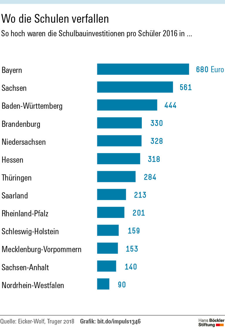 Dabei gibt es der Analyse zufolge erhebliche Unterschiede zwischen den Bundesländern: Die Sachinvestitionen pro Einwohner fallen in Bayern in allen Jahren seit 2011 mehr als doppelt so hoch aus wie in Nordrhein-Westfalen. Noch deutlicher sind die Unterschiede bei den Investitionen in Schulgebäude: 2016 gaben die bayerischen Gemeinden 680 Euro pro Schüler aus, die nordrhein-westfälischen 90 Euro.