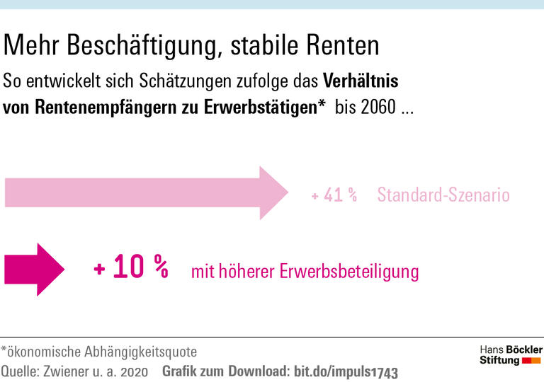 Welchen Effekt eine auf mehr Beschäftigung ausgelegte Arbeitsmarktpolitik, zusätzliche Investitionen und höhere Löhne haben können, zeigen die Wissenschaftler anhand einer Modellrechnung. Ergebnis: Die Zahl der Erwerbstätigen ließe sich mit entsprechenden Maßnahmen innerhalb von anderthalb Jahrzehnten um zwei Millionen anheben, was auch die Steuereinnahmen und den privaten Konsum steigern würde. Das Bruttoinlandsprodukt könnte in dieser Zeit um gut fünf Prozent zusätzlich wachsen. Auch auf das Rentensystem würde sich die höhere Erwerbsbeteiligung positiv auswirken. Im besten Fall – bei einer Erwerbstätigenquote, wie sie heute bereits in Schweden existiert – würde die ökonomische Abhängigkeitsquote nur um zehn Prozent steigen, die Folgen für die Alterssicherung wären gut beherrschbar. Vor allem die Renten pro Kopf würden preisbereinigt deutlich steigen. Das Fazit der Forscher: Die Behauptung, höhere Renten seien unfinanzierbar oder gefährdeten den Wirtschaftsstandort, ist haltlos. Mit den richtigen arbeitsmarkt- und fiskalpolitischen Maßnahmen lässt sich der demografische Wandel bewältigen. Zusätzlich empfehlen die Wissenschaftler, die Rentenversicherung zur Erwerbstätigenversicherung auszubauen, in die auch neue Beamte und Selbstständige einzahlen.