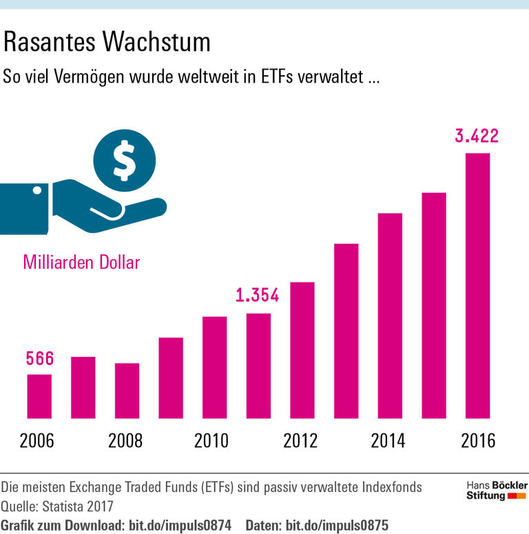 An Einfluss gewonnen haben vor allem Vermögensverwalter wie BlackRock, StateStreet oder Vanguard Group. Die Finanzkrise hat ihnen wenig anhaben können. Im Gegenteil: Während die Banken stärker reguliert wurden, sind BlackRock und Co. noch mächtiger geworden. Dabei handelt es sich um Investmentgesellschaften, die Geld einsammeln und im Auftrag ihrer Kunden verwalten. Sie kontrollieren Vermögen in Billionenhöhe. Ihre Strategien unterscheiden sich, aber die meisten haben eines gemeinsam: Sie investieren in Unternehmen, mit dem Ziel, eine möglichst hohe Rendite zu erzielen. Eine Besonderheit: Ein großer Teil des verwalteten Geldes steckt in passiven, quasi automatisierten Investmentvehikeln, sogenannten ETFs (Exchange Traded Funds). Bei einem passiven Indexfonds wird beispielsweise in alle Unternehmen eines bestimmten Index investiert, und zwar so viel, wie es dem Gewicht des Unternehmens im Aktienindex entspricht. Den Anlegern bietet ein ETF die verlockende Möglichkeit, mit nur einem Wertpapier kostengünstig in einen ganzen Markt zu investieren. Zu den Kunden zählen in erster Linie Vermögende, aber nicht nur, auch Kleinsparer sind darunter.