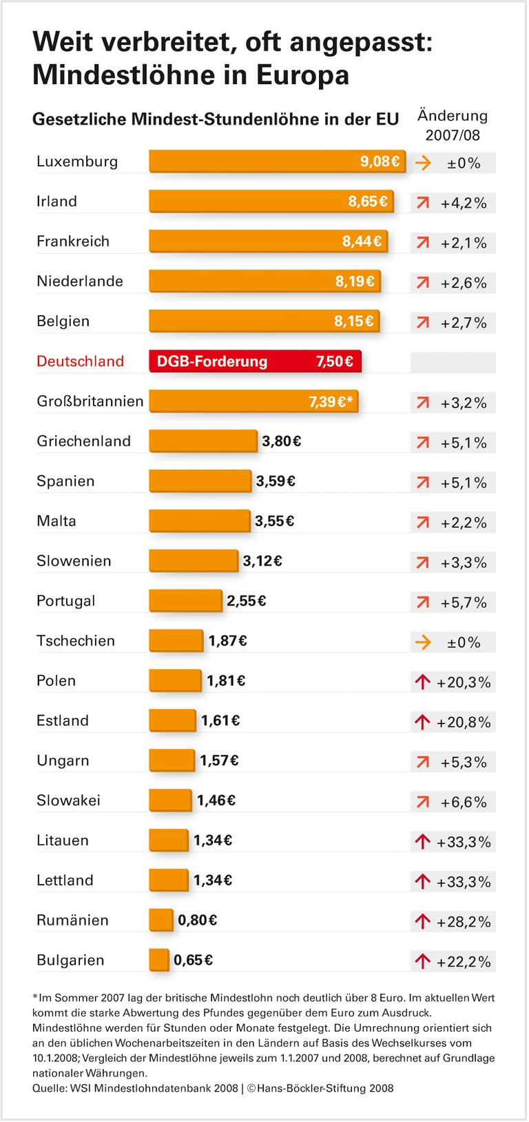 In 12 von 20 EU-Staaten sind die gesetzlichen Mindestlöhne zum 1. Januar 2008 erneut erhöht worden. Nachdem Großbritannien, Frankreich und Irland die niedrigsten erlaubten Stundenlöhne bereits im letzten Sommer oder Herbst aufgestockt hatten, haben zum Jahreswechsel die meisten mittel- und osteuropäischen Länder, Malta, Spanien und Portugal sowie Belgien und die Niederlande ihr gesetzliches Minimum nach oben angepasst.