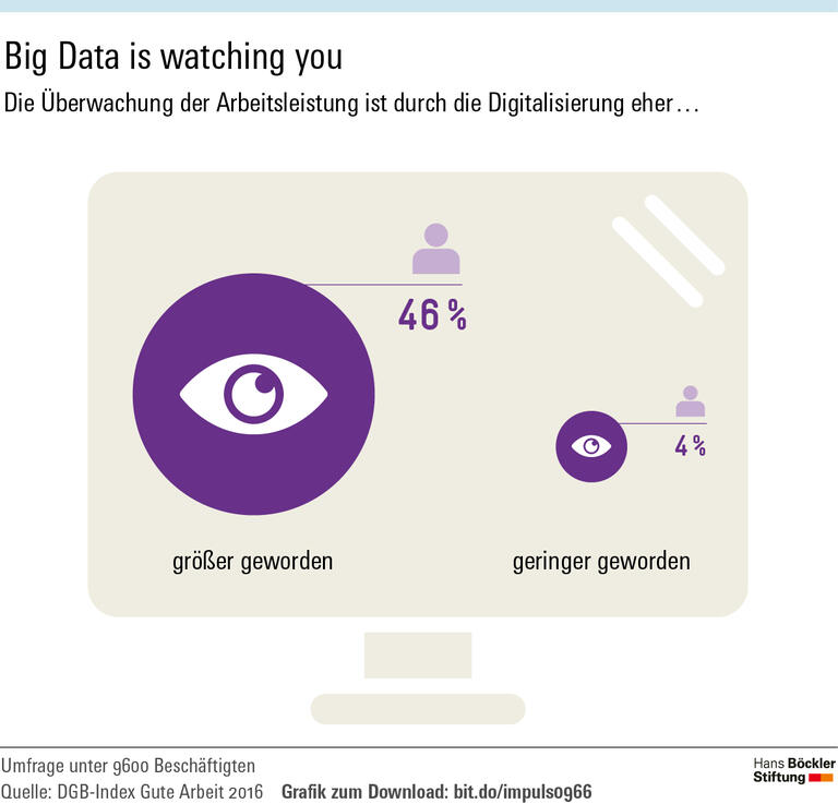 Beschäftigte zu kontrollieren, wird durch die Digitalisierung erheblich erleichtert. Cloud-Technologien und internes Crowdsourcing eröffnen neue Möglichkeiten der Vergleichbarkeit und Auswertung; interne und externe Rankings erhöhen den Leistungsdruck. Umso wichtiger sei es, die informationelle Selbstbestimmung am Arbeitsplatz zu stärken, erklärt die von der Hans-Böckler-Stiftung initiierte Expertenkommission „Arbeit der Zukunft“. Ansonsten würden Beschäftigte neue Technologien kaum akzeptieren.