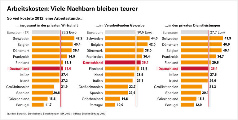 Bei den Arbeitskosten der Privatwirtschaft liegt Deutschland 2012 mit 31 Euro pro Arbeitsstunde weiterhin im westeuropäischen Mittelfeld. Neben dem Bruttolohn umfasst dieser Wert die Arbeitgeberanteile an den Sozialbeiträgen, Aufwendungen für Aus- und Weiterbildung sowie als Arbeitskosten geltende Steuern. Im Vergleich zu 2011 ist die Bundesrepublik um einen Rang nach hinten gerutscht und hat mit Finnland die Position getauscht. Höhere Arbeitskosten weisen unter anderem wichtige Handelspartner wie Frankreich, Belgien und Schweden auf. Die Skandinavier kommen für das vergangene Jahr mit 42,20 Euro pro Stunde auf die höchsten Arbeitskosten in Europa. Das liegt allerdings auch an der Aufwertung der Schwedischen Krone. In den Krisenländern Italien, Irland, Spanien, Griechenland und Portugal reichen sie von 27,40 bis 11,70 Euro die Stunde.