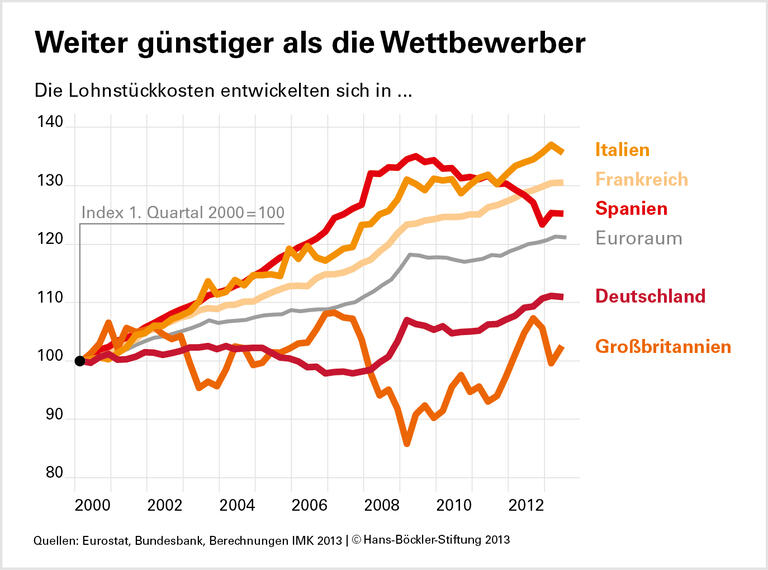 Für die Lohnstückkosten, also die Arbeitskosten korrigiert um Produktivitätszuwächse, beobachtet das IMK dasselbe Muster wie bei den Arbeitskosten: In Deutschland legten sie 2012 um 2,9 Prozent zu, im Euroraum-Durchschnitt nur um 1,9 Prozent. Zwischen Anfang 2000 und Mitte 2012 wuchsen die deutschen Lohnstückkosten im Jahresmittel lediglich um knapp 0,7 Prozent – und damit deutlich langsamer als im Euroraum insgesamt mit 1,7 Prozent. Zwischen 2000 und dem Beginn des Jahres 2008 stagnierten sie sogar. Auch wenn sich der über Jahre aufgelaufene Abstand zwischen der Bundesrepublik und ihren Euro-Partnern nun verringere, „hat Deutschland gegenüber dem Rest Europas weiterhin einen extrem hohen preislichen Wettbewerbsvorteil“, schreiben die Wissenschaftler. Das bedeutet: Deutschlands hoher Leistungsbilanzüberschuss von mehr als 185 Milliarden Euro im vergangenen Jahr werde 2013 wahrscheinlich nicht zurückgehen, „obwohl die Krisenländer Europas ihre Importe zurückfahren müssen“.