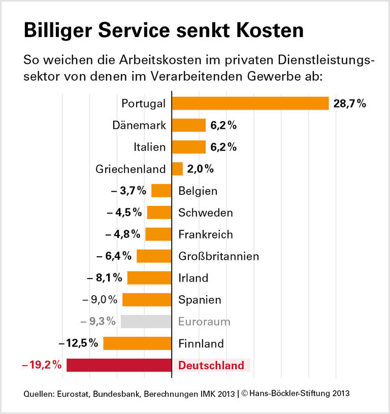 Eine deutsche Besonderheit bilden immer noch die vergleichsweise niedrigen Arbeitskosten bei den privaten Dienstleistungen: Sie betrugen 2012 lediglich 28,40 Euro, was nur unwesentlich über dem Durchschnitt des Euroraums von 27,70 Euro liegt – und knapp 20 Prozent unter denen des Verarbeitenden Gewerbes. Auf den höchsten Wert kommt auch bei den Arbeitskosten für Dienstleistungen Schweden mit 41,90 Euro. Erstmals seit Beginn der Währungsunion legten diese Arbeitskosten in Deutschland mit 3,1 Prozent aber stärker zu als im Euroraum-Durchschnitt von 2,1 Prozent. Dennoch gilt: „In keinem anderen Land der Europäischen Union sind die Arbeitskosten im privaten Dienstleistungssektor in Relation zu denen im Verarbeitenden Gewerbe so niedrig“, erläutern die Wissenschaftler.