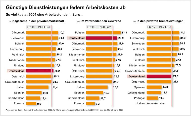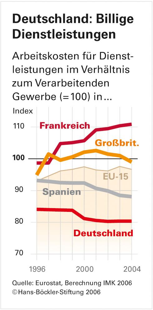 Im privaten Dienstleistungssektor entsprechen die Arbeitskosten in Deutschland gerade einmal dem EU-15-Durchschnitt. Damit liegen sie deutlich unter dem Niveau der anderen großen europäischen Länder (mit Ausnahme Spaniens). "Dieses Ergebnis ist erstaunlich", urteilen die Forscher des IMK, "weil alle anderen Länder, die überdurchschnittliche Arbeitskosten im Verarbeitenden Gewerbe aufweisen, auch überdurchschnittlich hohe Arbeitskosten im Dienstleistungssektor verzeichnen."