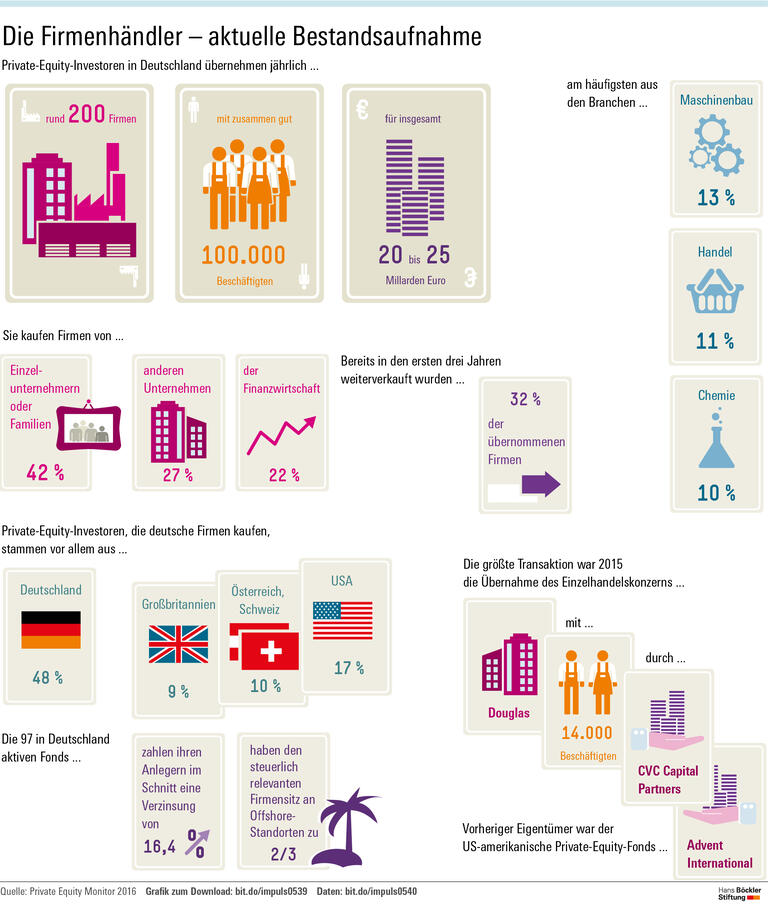 Viele Beobachter befürchteten, sie würden die Kontrolle über weite Teile der Volkswirtschaft übernehmen. Doch es kam anders: „Tatsächlich wurde dieser Buyout-Boom durch die Finanzmarktkrise ab September 2008 jäh gestoppt“, so der Private Equity Monitor 2016 der Hans-Böckler-Stiftung. Die Beteiligungsgesellschaften (Private Equity) sind jedoch weiterhin sehr aktiv in Deutschland. Jährlich werden Unternehmen mit rund 100.000 Beschäftigten von den Finanzinvestoren erworben; derzeit befinden sich mehr als fünfzig Unternehmen mit jeweils über 2.000 Beschäftigten in der Hand von Private-Equity-Investoren. Häufig ist der Verkäufer ebenso ein Finanzinvestor wie der Käufer. Die übernommenen Firmen wechseln meist nach wenigen Jahren den Besitzer. Die auffälligste Entwicklung in jüngster Zeit: Private-Equity-Gesellschaften verkaufen Unternehmen zunehmend nach Asien weiter. Insgesamt kommt die Studie zu dem Schluss, die Private-Equity-Branche müsse sich heute „mit anderen großen Akteuren in der Real- und Finanzwirtschaft beziehungsweise dem System der industriellen Beziehungen in Deutschland arrangieren“.