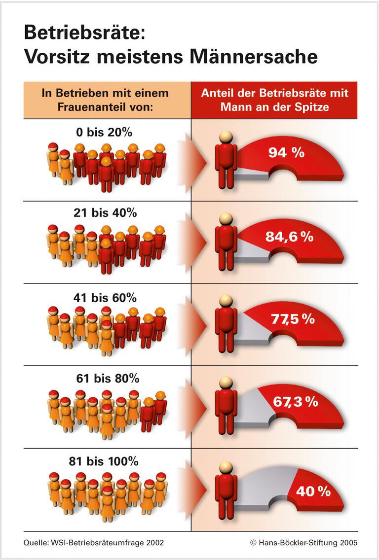 Schub durch Quote. Fast 70 Prozent der Betriebe haben jetzt einen Betriebsrat, in dem Frauen und Männer gemäß ihren Anteilen in der Belegschaft vertreten sind. In 44 Prozent der Betriebe gibt es mehr, in 10 Prozent weniger Frauen als vor der Quote.