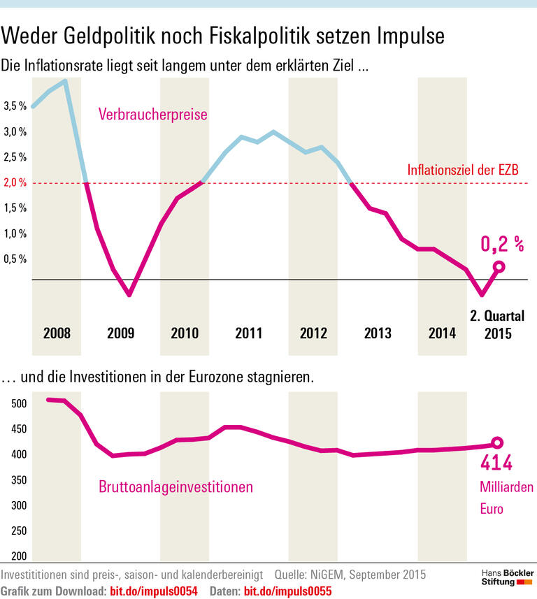 Der Wissenschaftler sieht darin auch ein Erbe der deutschen Bundesbank, nach deren Vorbild die EZB einst gestaltet wurde. Bis heute werde sowohl die Geisteshaltung als auch die Geldpolitik der Zentralbank in einem „ungesunden Ausmaß“ von Deutschland dominiert. Aus diesem Grund habe die EZB – anders als etwa die US-Notenbank – keine Impulse für Wachstum und Binnennachfrage setzen können. Stattdessen habe sie sich lange darauf konzentriert, die Inflation niedrig zu halten, dabei aber die eigentliche Gefahr ignoriert. „Die EZB scheint unaufhörlich von Inflationsrisiken besessen, aber notorisch selbstgefällig in Bezug auf Stagnation und Deflationsrisiken zu sein“, konstatiert Bibow.