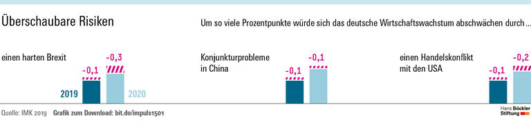 Die IMK-Forscher gehen in ihren Berechnungen davon aus, dass es keinen „harten“ Brexit geben wird, sondern dass Großbritannien auf absehbare Zeit Mitglied in der europäischen Zollunion bleibt. Alternativ haben sie auch durchgerechnet, was ein kurzfristiger Brexit „ohne Deal“ für die deutsche Wirtschaft bedeuten würde. Und was passieren würde, wenn sich gleichzeitig das Wachstum in China noch stärker als erwartet abschwächen und der Handelskonflikt zwischen den USA und der EU unerwartet zuspitzen sollte.