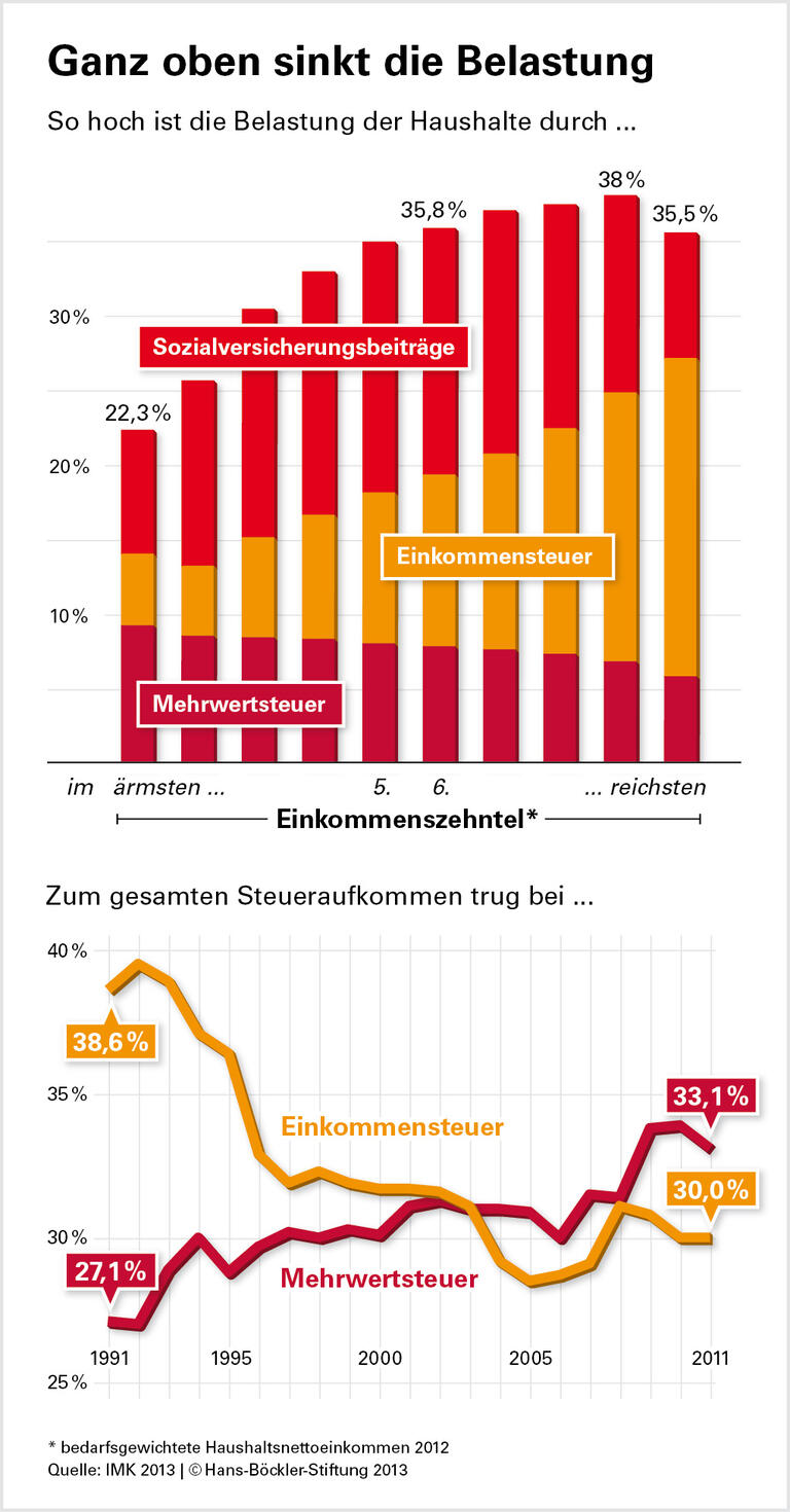 Top-Verdiener in Deutschland werden durch Steuern und Abgaben relativ wenig belastet. Der Trend zu höheren Verbrauchssteuern hat das noch verschärft.
