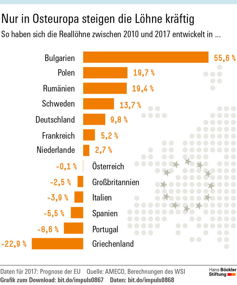 Betrachtet man die Entwicklung der Reallöhne über einen längeren Zeitraum, so zeigt sich: Die Folgen der Eurokrise sind längst noch nicht überwunden. In zehn EU-Staaten liegt das Reallohnniveau noch immer unterhalb des Niveaus des Krisenjahrs 2009. Am deutlichsten ist diese Entwicklung in Griechenland, wo die Reallöhne zwischen 2010 und 2017 um fast 23 Prozent gefallen sind, gefolgt von Zypern (-12,8 Prozent), Portugal (-8,6 Prozent), Kroatien (-5,8 Prozent) und Spanien (-5,5 Prozent). Lediglich in einigen osteuropäischen Ländern kam es im gleichen Zeitraum zu kräftigen Reallohnzuwächsen, allerdings ausgehend von einem sehr niedrigen Niveau. Außerhalb von Osteuropa konnten vor allem Schweden (13,7 Prozent) und Deutschland (9,8 Prozent) seit 2010 deutlichere Reallohnzuwächse verzeichnen.