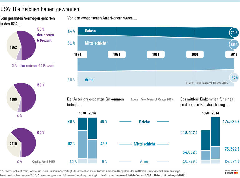 Rakesh Kochhar, Richard Fry, Molly Rohal: The American Middle Class Is Losing Ground. No longer the majority and falling behind financially (pdf), Pew Research Center, Dezember 2015