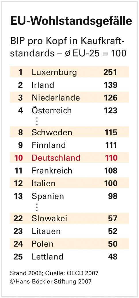Am reichsten ist Luxemburg: Hier war das Bruttoinlandsprodukt je Einwohner im Jahr 2005 kaufkraftbereinigt zweieinhalb mal so hoch wie im EU-Durchschnitt, teilt die Statistikbehörde Eurostat mit. Lettland hingegen erreicht nur knapp die Hälfte des Durchschnittswertes und ist damit Schlusslicht in der EU-25. Deutschland liegt auf Rang zehn der europäischen Wohlstandsskala.