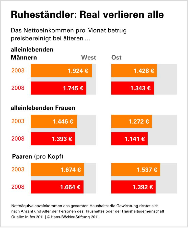 Single-Haushalte. Alleinlebende ältere Männer in Westdeutschland haben das höchste Gesamteinkommen. 2003 lag es bei durchschnittlich 1.924 Euro. Allerdings wird dieser Mittelwert – wie bei allen westdeutschen Haushaltstypen – von den vergleichsweise hohen Altersbezügen pensionierter Beamter mit beeinflusst. Nominal stagnierte das Einkommen in dieser Gruppe zwischen 2003 und 2008. Real, also nach Abzug der Preissteigerung, sank es um rund 180 Euro. Die Einkommen von alleinstehenden Senioren in Ost- und alleinlebenden Seniorinnen in Westdeutschland nahmen nominal leicht zu, real büßten beide Gruppen jedoch ebenfalls ein – bei erheblich geringeren absoluten Einkommenshöhen. Ostdeutsche Frauen im Rentenalter hatten nominal und real Verluste zu verzeichnen.
