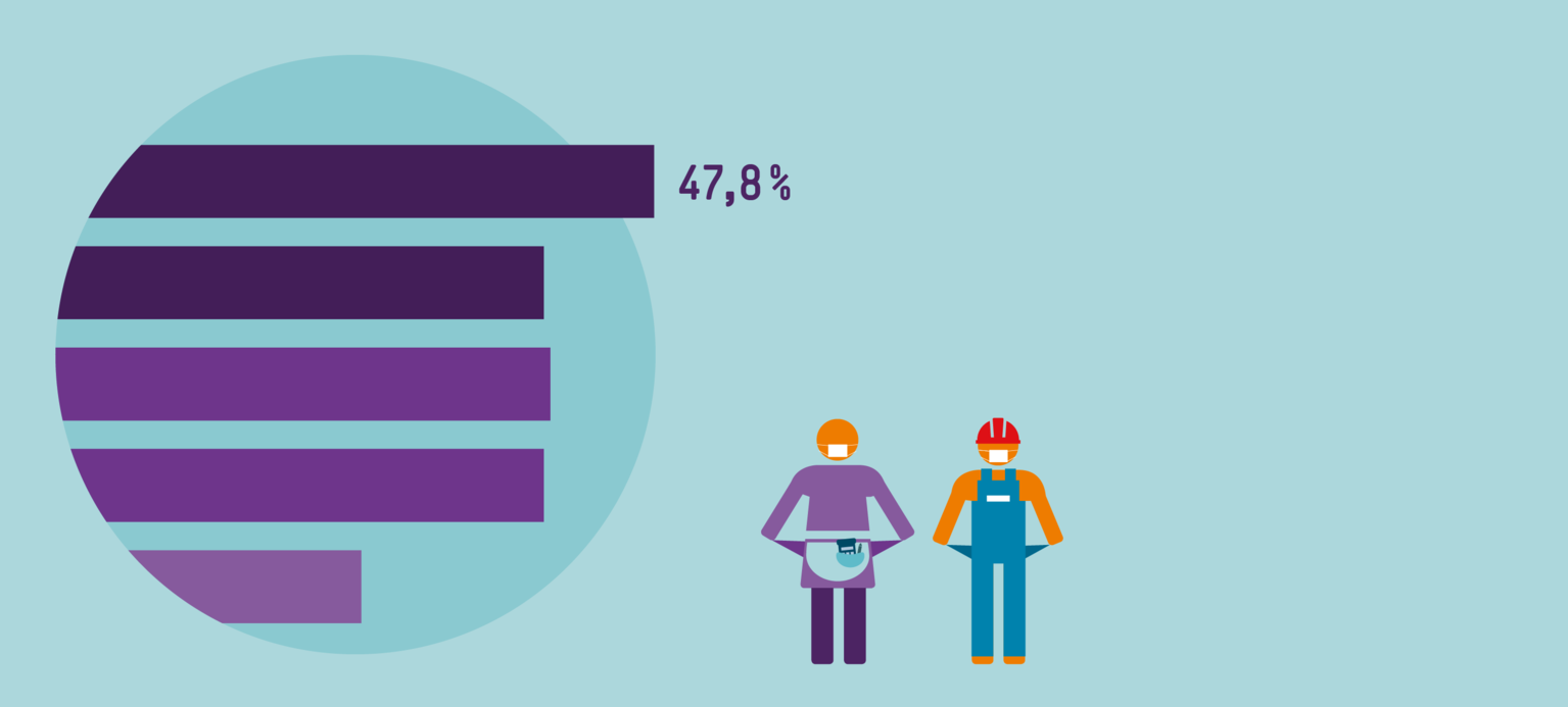 Insgesamt gaben rund 32 Prozent der Befragten an, im April oder im Juni 2020 Einkommen durch die Pandemie eingebüßt zu haben. Erwerbstätige mit Migrationshintergrund waren stärker betroffen: Selbst wenn man Faktoren wie das Bildungsniveaus oder die Branche herausrechnet, kam es bei ihnen öfter zu Einkommensverlusten. Eltern mussten im Vergleich zu Kinderlosen häufiger Einbußen verkraften. In der unteren Einkommensgruppe mit maximal 900 Euro netto monatlich waren fast 48 Prozent betroffen, während es in der obersten Gruppe mit mehr als 4 500 Euro netto knapp 27 Prozent waren. Auch Befragte in Leiharbeit oder Minijobs berichteten häufiger von einem Minus. Hingegen fiel das Risiko bei unbefristeter Beschäftigung oder in Unternehmen mit Tarifvertrag und Betriebsrat niedriger aus.